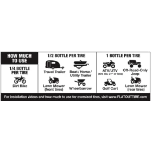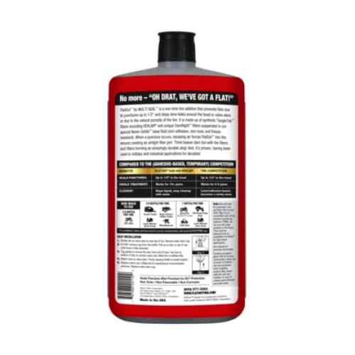 FlatOut Tire Additive by MULTI SEAL prevents flats AND seals leaks. Increases tire life, improves fuel economy, prevents up to 95% of flats, so you Save Money, Save Time, and Stay Safe. Engineered with super-strong KEVLAR fibers to seal puncture after puncture, providing 24/7 protection for 10+ years. Provides serious puncture protection — up to 1/2 inch in the tread area — so you don’t get stranded and don’t ruin your weekend! MULTI SEAL has been the leader in industrial tire additive technology for over 35 years, trusted by military, delivery fleets, and other demanding industrial users. Now, you can get that same extreme performance with the Sportsman Formula for ATVs, UTVs/Side-by-Sides, Golf Carts, Dirt Bikes, Off-Road-Only Jeeps and more. Unique formula with super-strong Kevlar fiber is non-toxic — plus NO latex/adhesives (glue!), so FlatOut never gets sticky … always remains liquid … washes out easily with plain water. Simple to install with Easy Dispensing Cap. Non-flammable, non-toxic, non-corrosive, non-aerosol. Proudly Made in the USA. Use one 32-ounce bottle for each tire in most ATV, UTV, Golf Cart, and Off-Road-Only Jeep applications. (One 32-ounce bottle is enough for 4 dirt bike tires, in most applications.) IMPORTANT NOTE: Not intended for passenger cars and light-duty trucks/SUVs. Not for use with internal tire pressure monitoring systems (TPMS). Do not use it with other sealants or flat fixers.