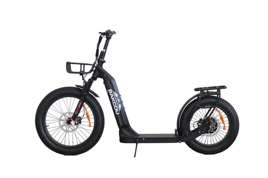 The Timberwolf is fully-equipped with Tektro dual-piston brakes in the front and rear, 400 Lumen Headlight, a Rear Pannier Rack, and Front and Rear Mud Fenders. The 24-inch front tire makes climbing over rocky terrain a breeze. Foldable handlebars make hauling this scooter to the mountains a breeze, and the kickstand helps keep it upright.Â