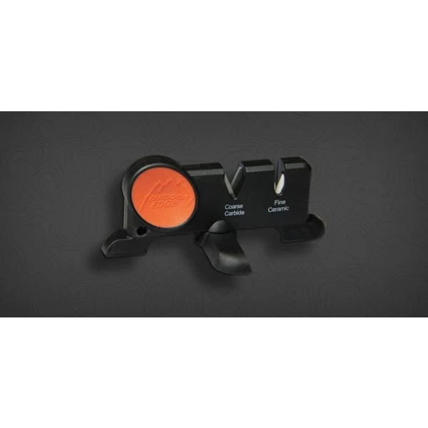 The perfect, pocket-sized sharpener for shaping and maintaining a razor-sharp edge on all your outdoor and kitchen knives. The pivoting X-base folds out to improve safety and stability during sharpening for a more precise edge. Set at a universal 22 degree angle, the coarse tungsten carbide bits reshape a dull blade quickly, while the fine ceramic rods finish the blade to a razor’s edge. The rubberized TPR finger hold ensures a non-slip grip and four 3M® rubber foot pads secure the X-base to most any flat surface. After use, the Sharp-X folds down flat for storage.