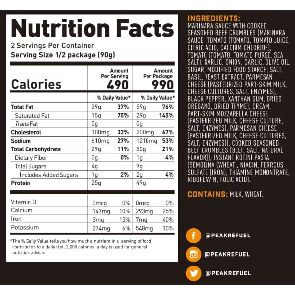 After a long day of following your compass, settle down with some home-style marinara mixed with firm spiral noodles, real ground beef, vegetables, spices, and pure goodness. Now how do we do that? By only using premium, freeze-dried, all natural ingredients that keep their shape, taste, and nutritional value. Giving you 49 grams of protein, 40% of your daily iron, and 25% of your daily calcium, just add 1 1/3 cups of water and restore your energy and get ready for the next stage of your adventure.