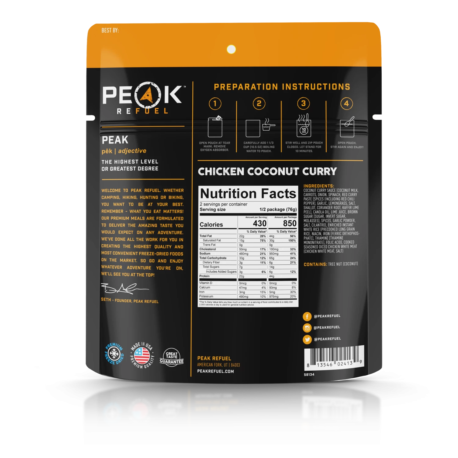 It’s the end of a long day in the backcountry and you’re craving a home-cooked meal. Enter: Chicken Coconut Curry. With juicy chicken, rice, vegetables, and a coconut curry sauce that is out of this world, you’ll be glad you packed this. And yes, you read that right – 44g of protein per pouch!