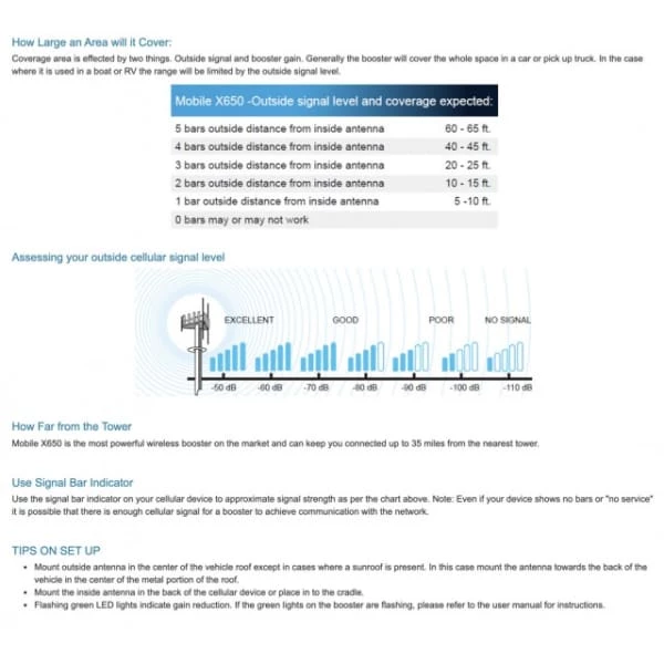 The Smoothtalker Mobile X6 Extreme Power Booster is the most technologically advanced wireless cellular signal booster made. It features proprietary “stealth tech technology” that prevents shutdowns from poor antenna placement and changing environment. This booster has 50dB of gain and provides coverage throughout your car, truck RVs, Boats, work trailers.
