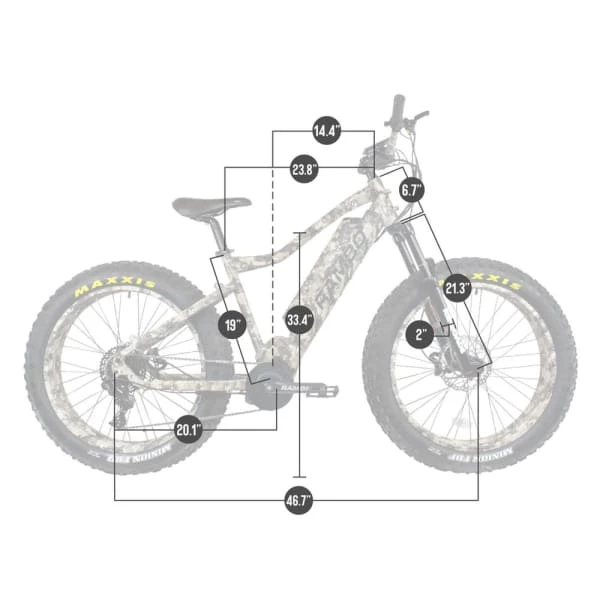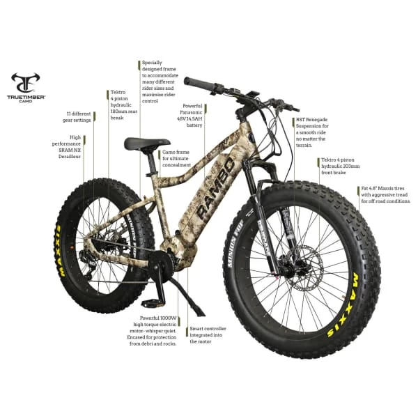 The Rambo Rebel 1000W Xtreme Performance electric fat tire bike is designed by customer request for the Extreme Rider that will only settle for the best. Big game hunting the backwoods in steep grade conditions, trail riding in rough terrain, or cruising down the beach the 1000 XPC has the job covered with high end RST Renegade suspension, a 1000W extreme performance motor, and all the high-end bike components to match. No costs were spared to build the most extreme off-road fat bike. The frame is TrueTimber Viper Western Camo for both concealment and looks. And the Rambo Rebel 1000W True Timber Viper Western Camo Xtreme Performance features a custom-built frame to encase and heighten the motor for increased ground clearance and protection. The Rambo Rebel 1000W TrueTimber Viper Western Camo Xtreme Performance electric fat tire bike won’t disappoint!
